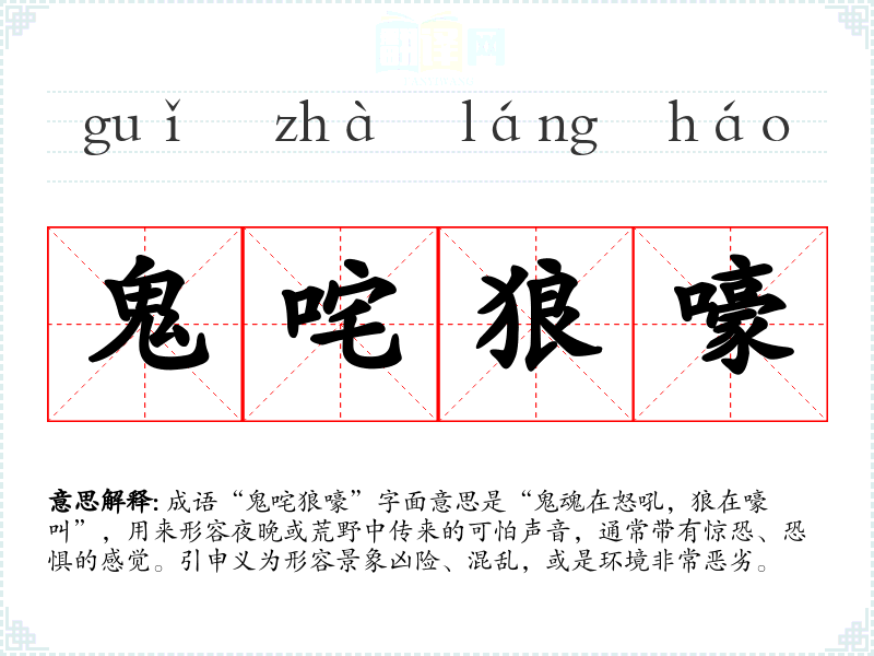 成语“鬼咤狼嚎”字面意思是“鬼魂在怒吼,狼在嚎叫”,用来形容夜晚或荒野中传来的可怕声音,通常带有惊恐、恐惧的感觉。引申义为形容景象凶险、混乱,或是环境非常恶劣。