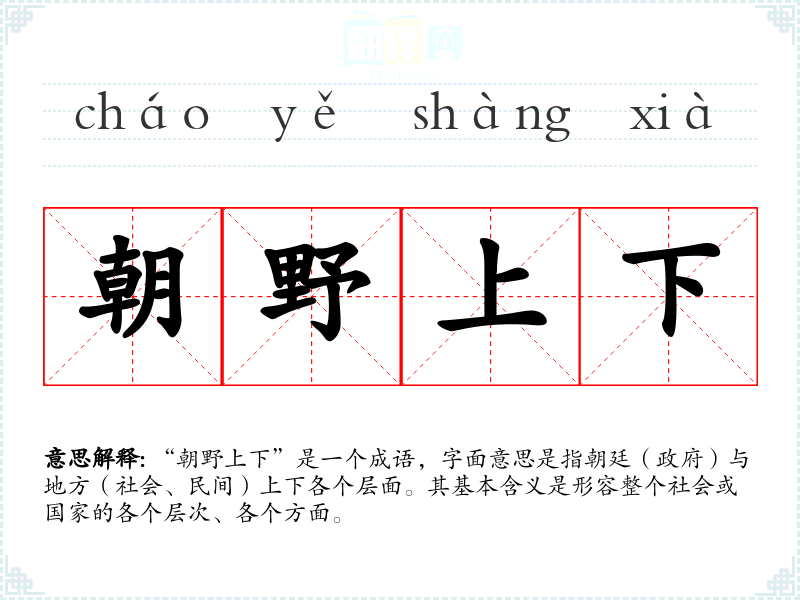 “朝野上下”是一个成语,字面意思是指朝廷(政府)与地方(社会、民间)上下各个层面。其基本含义是形容整个社会或国家的各个层次、各个方面。