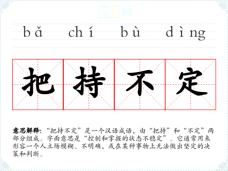 “把持不定”是一个汉语成语,由“把持”和“不定”两部分组成。字面意思是“控制和掌握的状态不稳定”。它通常用来形容一个人立场模糊、不明确,或在某种事物上无法做出坚定的决策和判断。