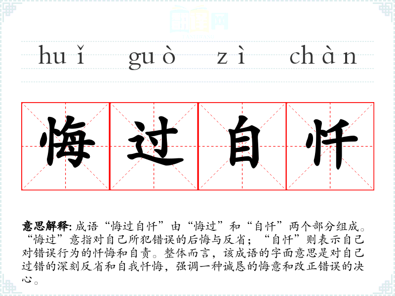 成语“悔过自忏”由“悔过”和“自忏”两个部分组成。“悔过”意指对自己所犯错误的后悔与反省;“自忏”则表示自己对错误行为的忏悔和自责。整体而言,该成语的字面意思是对自己过错的深刻反省和自我忏悔,强调一种诚恳的悔意和改正错误的决心。