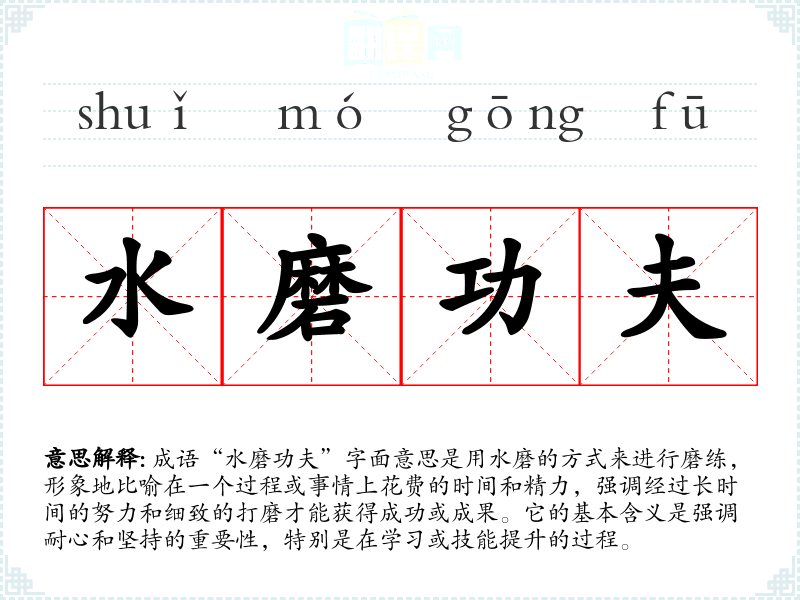 成语“水磨功夫”字面意思是用水磨的方式来进行磨练,形象地比喻在一个过程或事情上花费的时间和精力,强调经过长时间的努力和细致的打磨才能获得成功或成果。它的基本含义是强调耐心和坚持的重要性,特别是在学*或技能提升的过程。