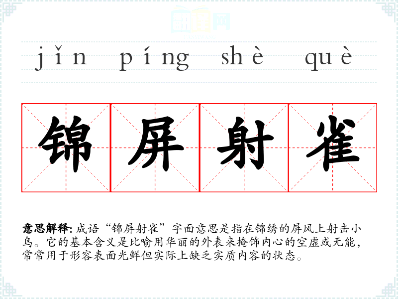 成语“锦屏射雀”字面意思是指在锦绣的屏风上射击**。它的基本含义是比喻用华丽的外表来掩饰内心的空虚或无能,常常用于形容表面光鲜但实际上缺乏实质内容的状态。