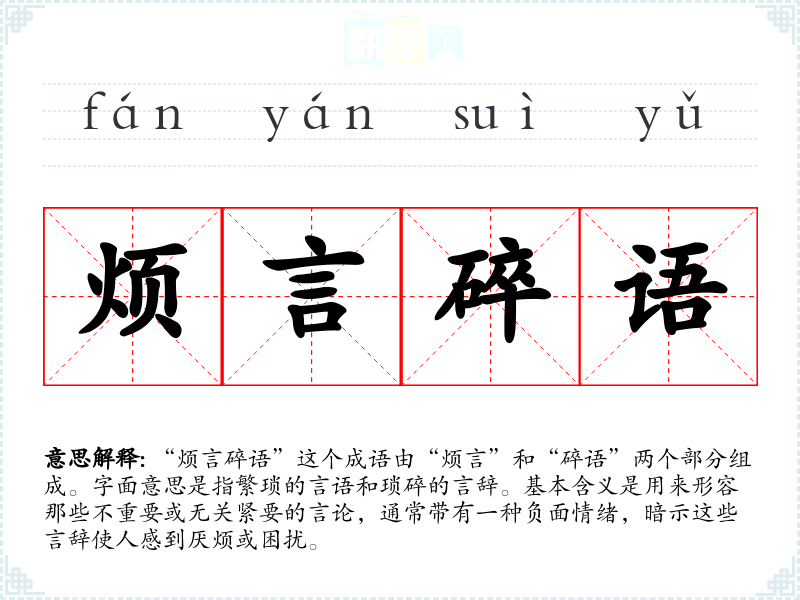 - 日常对话:人们在日常交流中,可能会用“烦言碎语”来表达对某些长篇大论的反感。