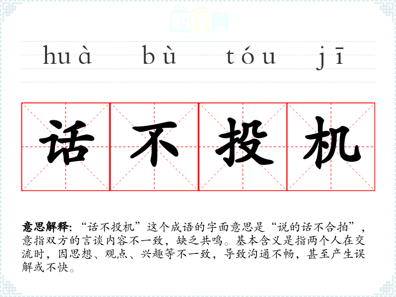 “话不投机”这个成语的字面意思是“说的话不合拍”,意指双方的言谈内容不一致,缺乏共鸣。基本含义是指两个人在交流时,因思想、观点、兴趣等不一致,导致沟通不畅,甚至产生误解或不快。