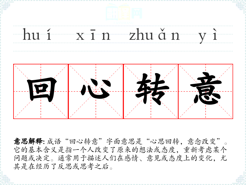 成语“回心转意”字面意思是“心思回转,意念改变”。它的基本含义是指一个人改变了原来的想法或态度,重新考虑某个问题或决定。通常用于描述人们在感情、意见或态度上的变化,尤其是在经历了反思或思考之后。