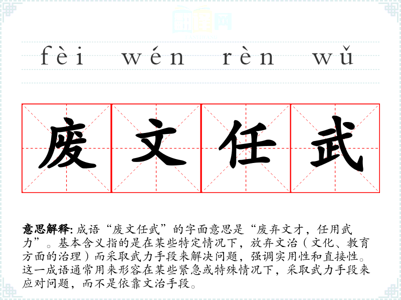 成语“废文任武”的字面意思是“废弃文才,任用武力”。基本含义指的是在某些特定情况下,放弃文治(文化、教育方面的治理)而采取武力手段来解决问题,强调实用性和直接性。这一成语通常用来形容在某些紧急或特殊情况下,采取武力手段来应对问题,而不是依靠文治手段。