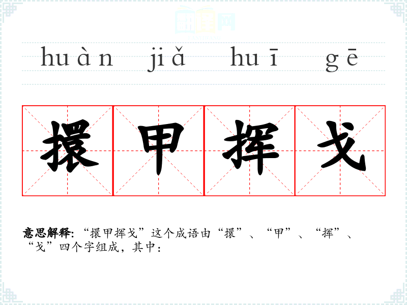 “擐甲挥戈”这个成语由“擐”、“甲”、“挥”、“戈”四个字组成,其中: