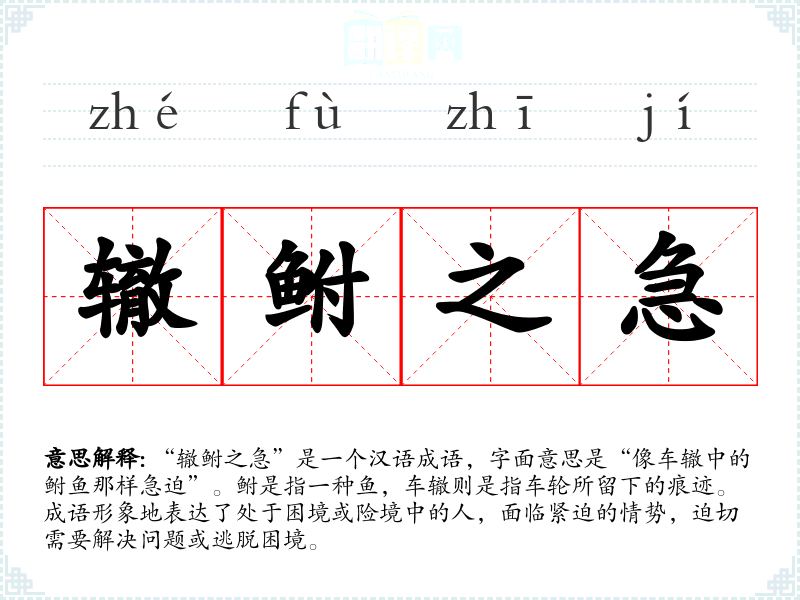 | 辙鲋之急 | 辙鲋:陷在干涸车辙中的鲫鱼。比喻因厄迫身 |