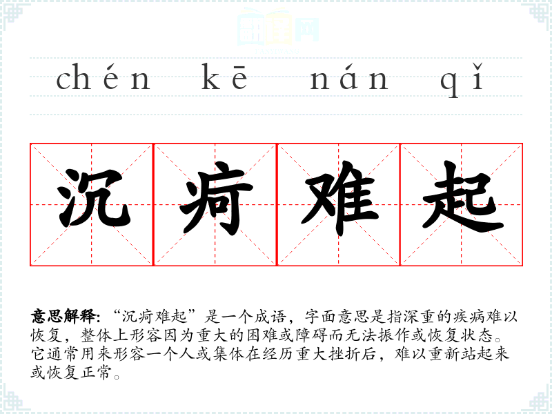 “沉疴难起”是一个成语,字面意思是指深重的疾病难以恢复,整体上形容因为重大的困难或障碍而无法振作或恢复状态。它通常用来形容一个人或集体在经历重大挫折后,难以重新站起来或恢复正常。