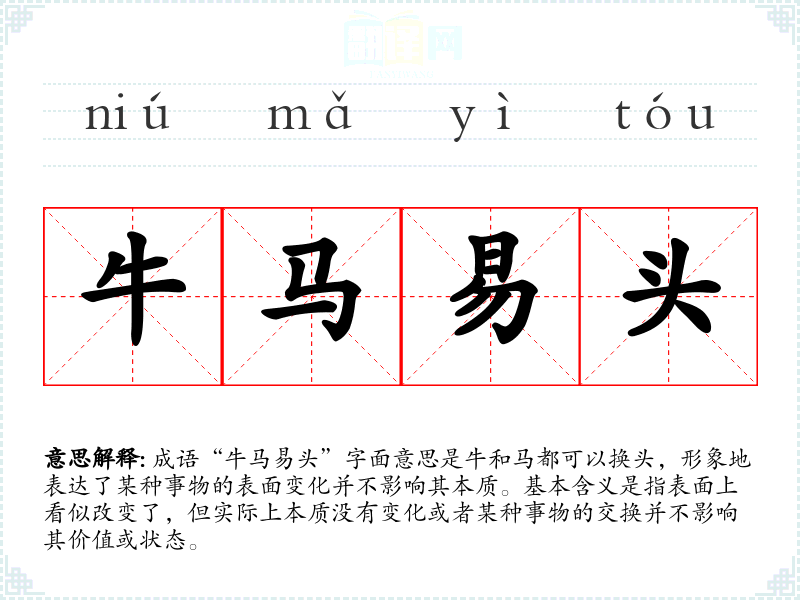 成语“牛马易头”字面意思是牛和马都可以换头,形象地表达了某种事物的表面变化并不影响其本质。基本含义是指表面上看似改变了,但实际上本质没有变化或者某种事物的交换并不影响其价值或状态。