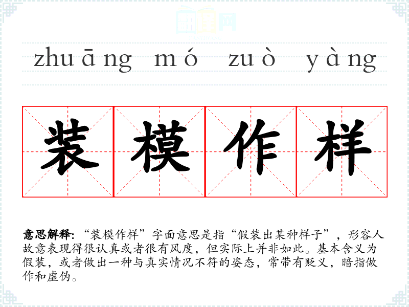 “装模作样”字面意思是指“假装出某种样子”,形容人故意表现得很认真或者很有风度,但实际上并非如此。基本含义为假装,或者做出一种与真实情况不符的姿态,常带有贬义,暗指做作和虚伪。