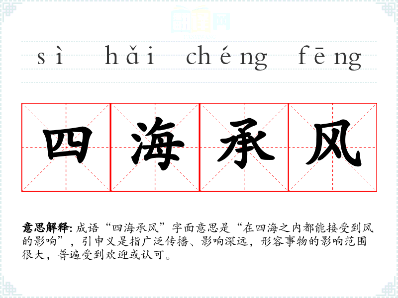 成语“四海承风”字面意思是“在四海之内都能接受到风的影响”,引申义是指广泛传播、影响深远,形容事物的影响范围很大,普遍受到欢迎或认可。