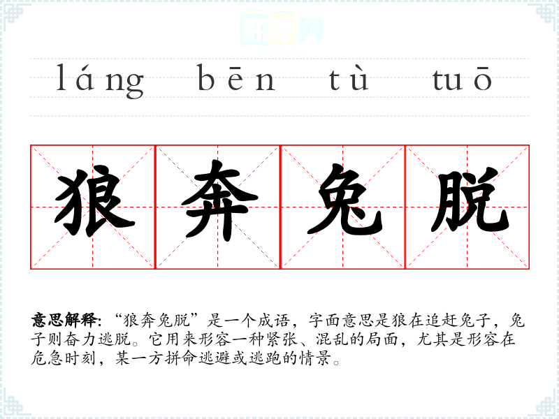 - 日常对话:可以用来形容某人面对突发**时的慌张状态,比如:“他在听到消息后,像狼奔兔脱一样跑了。”