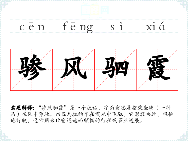 “骖风驷霞”是一个成语,字面意思是指乘坐骖(一种马)在风中奔驰,四匹马拉的车在霞光中飞驰。它形容快速、轻快地行驶,通常用来比喻迅速而顺畅的行程或事业进展。
