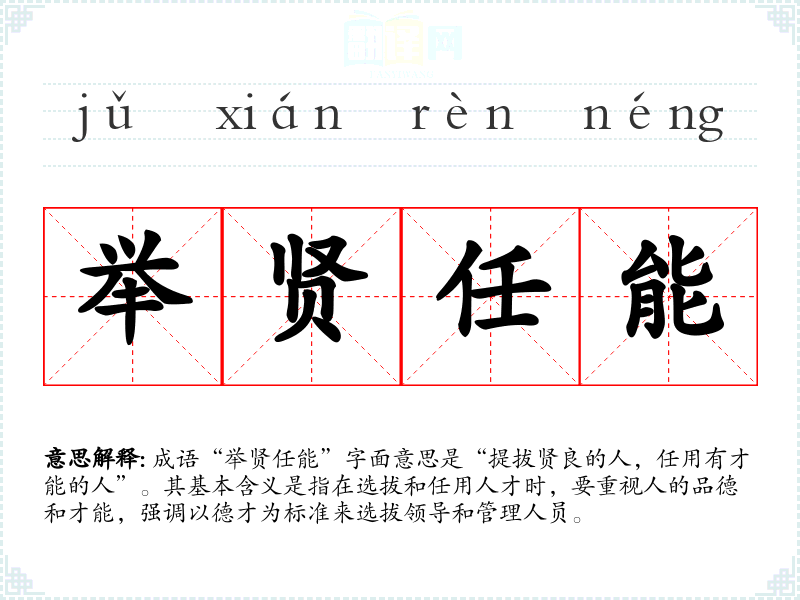 成语“举贤任能”字面意思是“提拔贤良的人,任用有才能的人”。其基本含义是指在选拔和任用人才时,要重视人的品德和才能,强调以德才为标准来选拔领导和管理人员。
