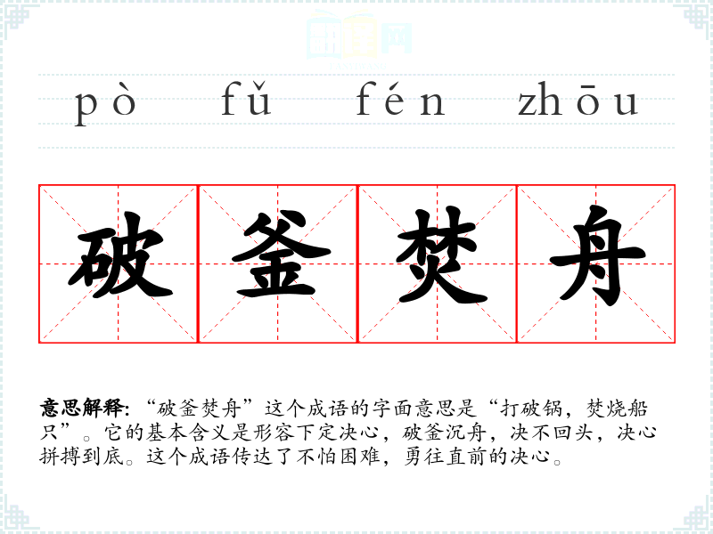 “破釜焚舟”这个成语的字面意思是“打破锅,焚烧船只”。它的基本含义是形容下定决心,破釜沉舟,决不回头,决心拼搏到底。这个成语传达了不怕困难,勇往直前的决心。