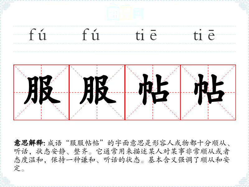 成语“服服帖帖”的字面意思是形容人或物都十分顺从、听话,状态安静、整齐。它通常用来描述某人对某事非常顺从或者态度温和,保持一种谦和、听话的状态。基本含义强调了顺从和安定。