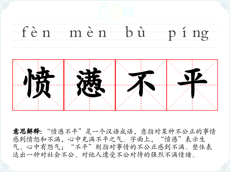 “愤懑不平”是一个汉语成语,意指对某种不公正的事情感到愤怒和不满,心中充满不平之气。字面上,“愤懑”表示生气、心中有怨气;“不平”则指对事情的不公正感到不满。整体表达出一种对社会不公、对他人遭受不公对待的强烈不满情绪。