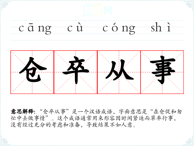 该成语出自《左传·僖公二十三年》:“仓卒从事,吾不知也。”这里的“仓卒”意指匆忙、急迫,表示没有充分的准备时间,而“从事”则是指进行某项活动或工作。成语的形成反映了古人对于行事应谨慎周全的态度。