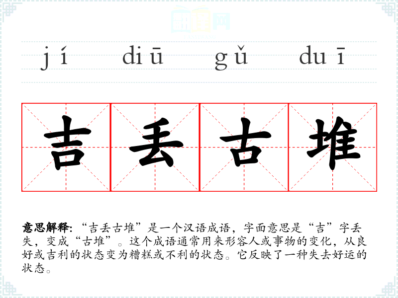 “吉丢古堆”是一个汉语成语,字面意思是“吉”字丢失,变成“古堆”。这个成语通常用来形容人或事物的变化,从良好或吉利的状态变为糟糕或不利的状态。它反映了一种失去好运的状态。