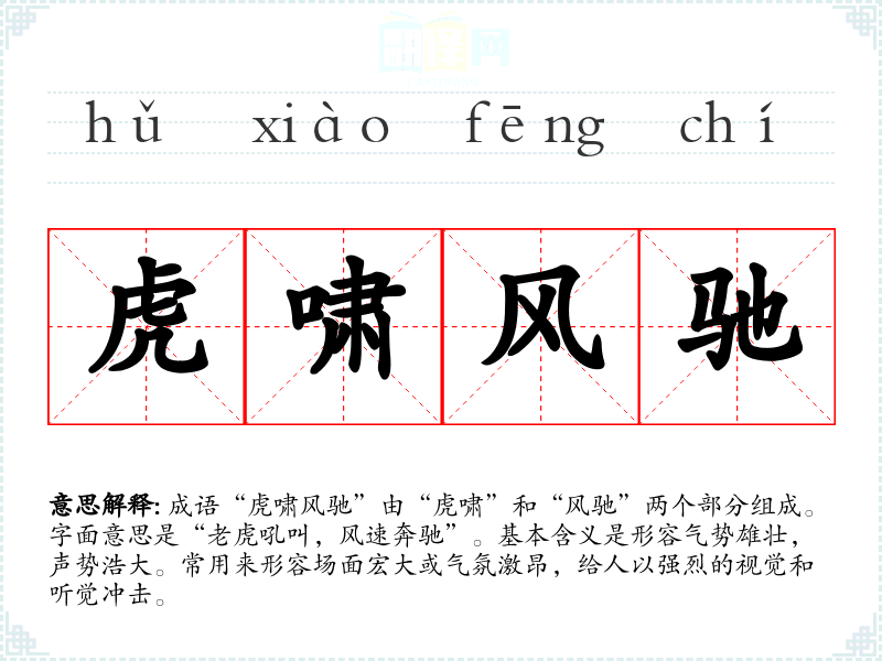成语“虎啸风驰”由“虎啸”和“风驰”两个部分组成。字面意思是“**吼叫,风速奔驰”。基本含义是形容气势雄壮,声势浩大。常用来形容场面宏大或气氛激昂,给人以强烈的视觉和听觉冲击。