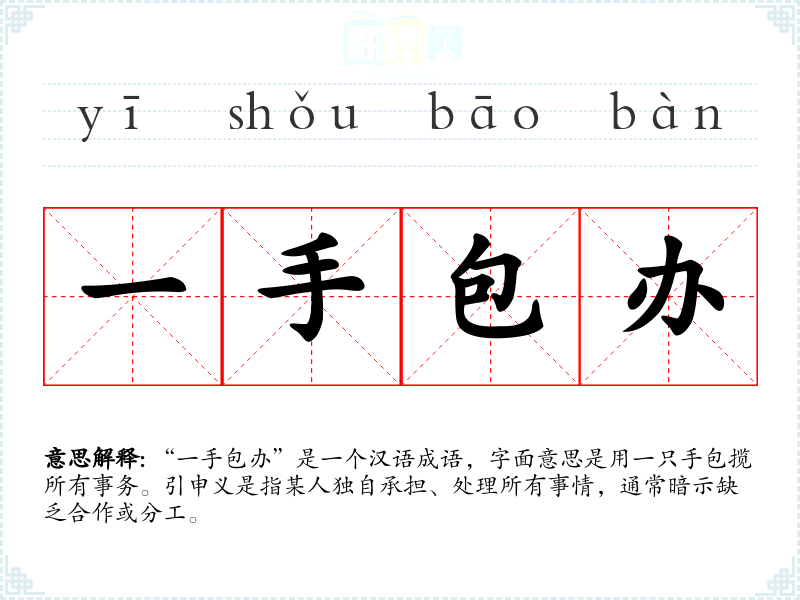 “一手包办”是一个汉语成语,字面意思是用一只手包揽所有事务。引申义是指某人独自承担、处理所有事情,通常暗示缺乏合作或分工。