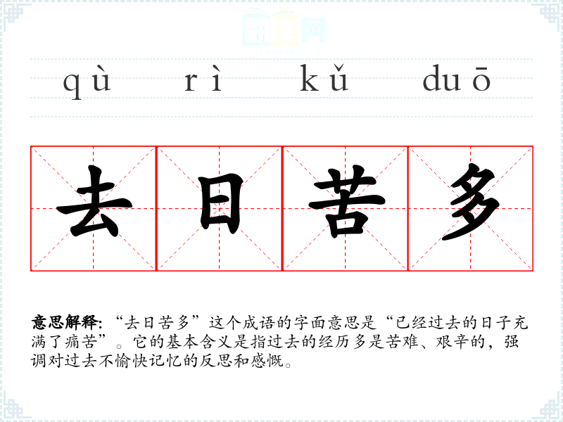 “去日苦多”这个成语的字面意思是“已经过去的日子充满了痛苦”。它的基本含义是指过去的经历多是苦难、艰辛的,强调对过去不愉快记忆的反思和感慨。