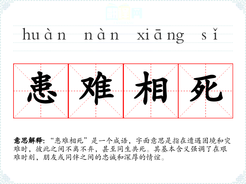 “患难相死”是一个成语,字面意思是指在遭遇困境和灾难时,彼此之间不离不弃,甚至同生共死。其基本含义强调了在艰难时刻,朋友或同伴之间的忠诚和深厚的情谊。