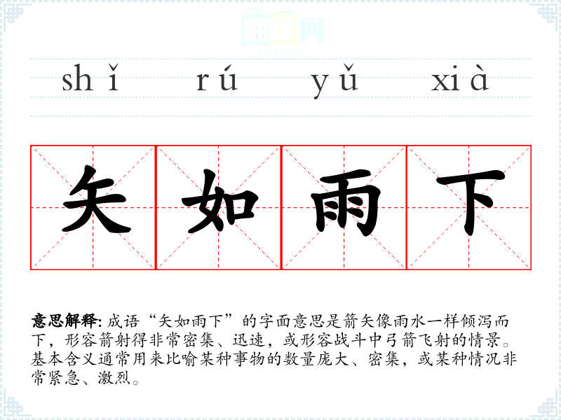 成语“矢如雨下”的字面意思是箭矢像雨水一样倾泻而下,形容箭射得非常密集、迅速,或形容战斗中弓箭飞射的情景。基本含义通常用来比喻某种事物的数量庞大、密集,或某种情况非常紧急、激烈。