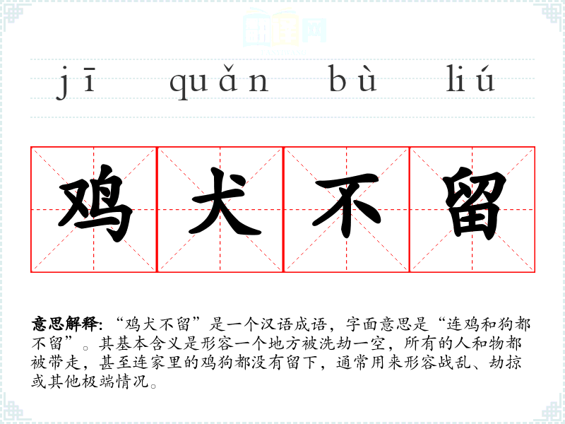 “鸡犬不留”是一个汉语成语,字面意思是“连鸡和狗都不留”。其基本含义是形容一个地方被洗劫一空,所有的人和物都被带走,甚至连家里的鸡狗都没有留下,通常用来形容战乱、劫掠或其他极端情况。