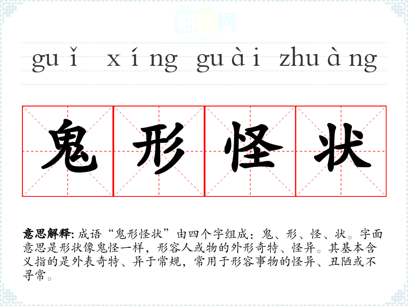 成语“鬼形怪状”由四个字组成:鬼、形、怪、状。字面意思是形状像鬼怪一样,形容人或物的外形奇特、怪异。其基本含义指的是外表奇特、异于常规,常用于形容事物的怪异、丑陋或不寻常。