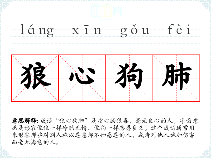 成语“狼心狗肺”是指心肠狠毒、毫无良心的人。字面意思是形容像狼一样冷酷无情,像狗一样忘恩负义。这个成语通常用来形容那些对别人施以恩惠却不知感恩的人,或者对他人施加伤害而毫无悔意的人。