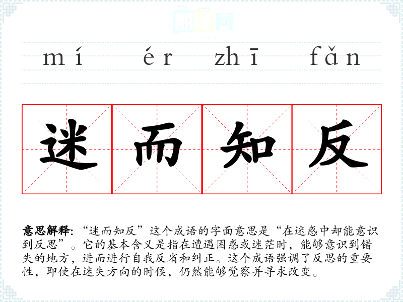 “迷而知反”这个成语的字面意思是“在迷惑中却能意识到反思”。它的基本含义是指在遭遇困惑或迷茫时,能够意识到错失的地方,进而进行自我反省和纠正。这个成语强调了反思的重要性,即使在迷失方向的时候,仍然能够觉察并寻求改变。