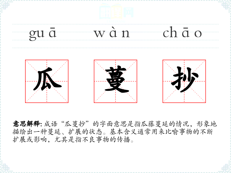 成语“瓜蔓抄”的字面意思是指瓜藤蔓延的情况,形象地描绘出一种蔓延、扩展的状态。基本含义通常用来比喻事物的不断扩展或影响,尤其是指不良事物的传播。