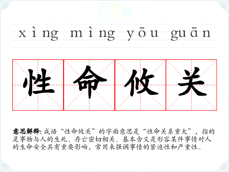 成语“性命攸关”的字面意思是“性命关系重大”,指的是事物与人的生死、存亡密切相关。基本含义是形容某件事情对人的生命安全具有重要影响,常用来强调事情的紧迫性和严重性。