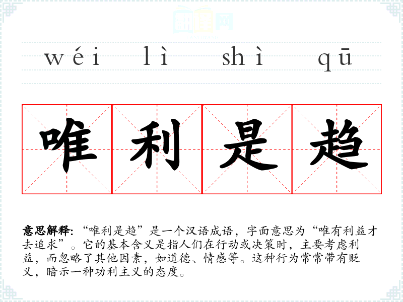 “唯利是趋”是一个汉语成语,字面意思为“唯有利益才去追求”。它的基本含义是指人们在行动或决策时,主要考虑利益,而忽略了其他因素,如道德、情感等。这种行为常常带有贬义,暗示一种功利主义的态度。