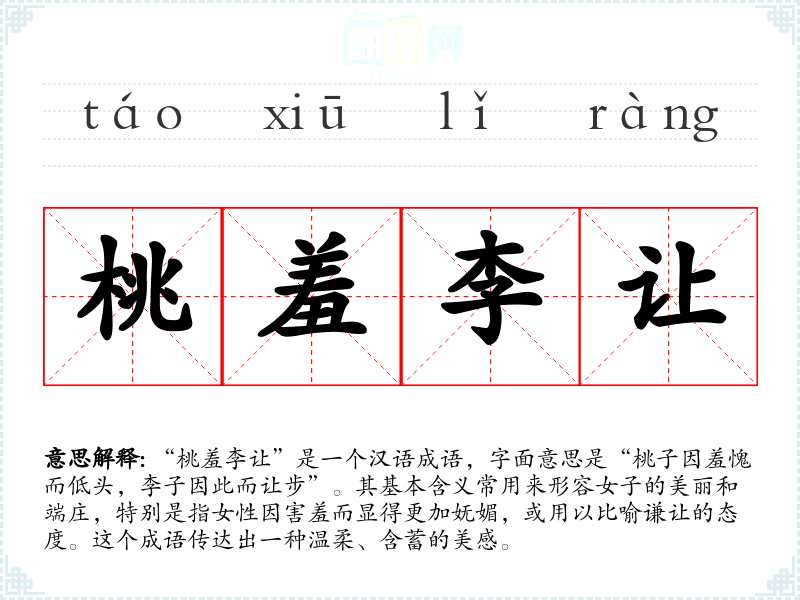 “桃羞李让”是一个汉语成语,字面意思是“桃子因羞愧而低头,李子因此而让步”。其基本含义常用来形容女子的美丽和端庄,特别是指女性因害羞而显得更加妩媚,或用以比喻谦让的态度。这个成语传达出一种温柔、含蓄的美感。