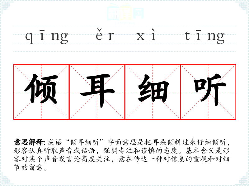“倾耳细听”并没有特定的历史典故或文学出处,但其构成的文字非常形象,体现了古代人们对听觉的重视。在古代,听取他人意见和声音被视为一种重要的社交技能和生存能力,因此该成语在实际生活中具有普遍的适用性。