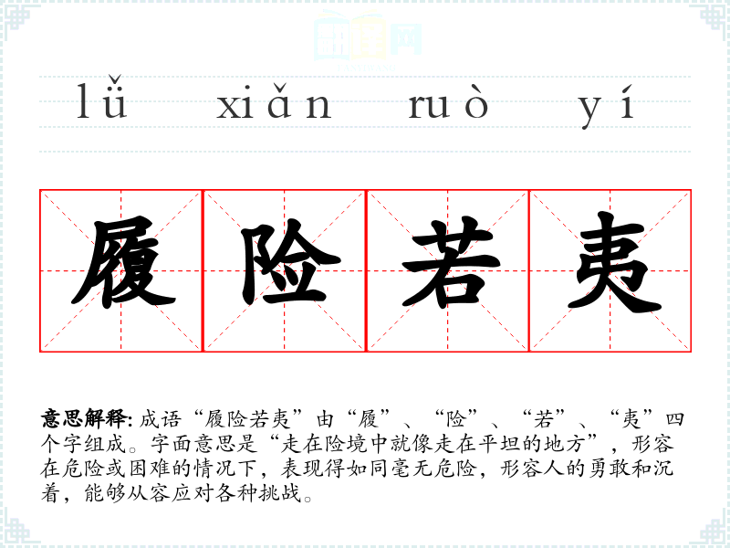 通过对“履险若夷”的学,我认识到在生活中,无论遇到多大的困难,都应该保持冷静和勇气。这不仅有助于解决问题,还能提升个人的应对能力和心理素质。在语言学和表达中,这一成语也让我更加了解如何用生动的语言表达复杂的情感和状态。