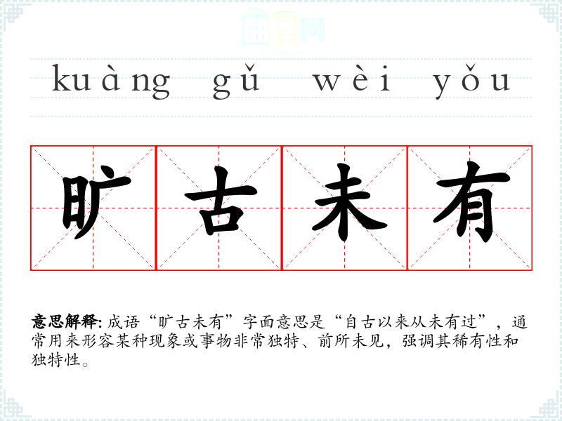 成语“旷古未有”字面意思是“自古以来从未有过”,通常用来形容某种现象或事物非常独特、前所未见,强调其稀有性和独特性。