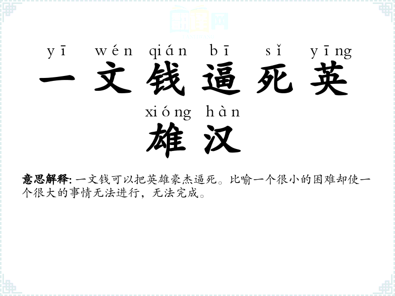 一文钱可以把英雄豪杰逼死。比喻一个很小的困难却使一个很大的事情无法进行,无法完成。 |