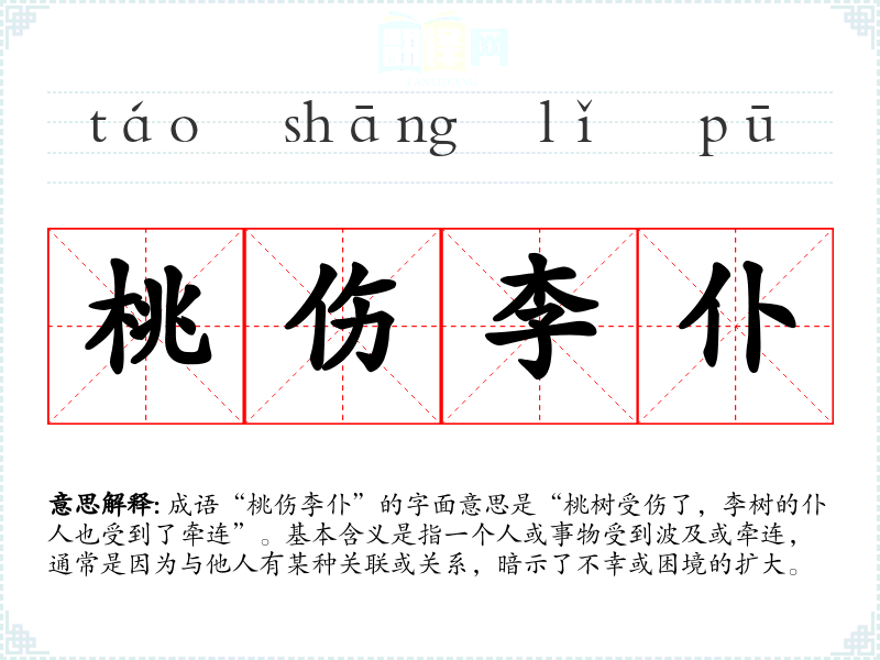 成语“桃伤李仆”的字面意思是“桃树受伤了,李树的仆人也受到了牵连”。基本含义是指一个人或事物受到波及或牵连,通常是因为与他人有某种关联或关系,暗示了不幸或困境的扩大。