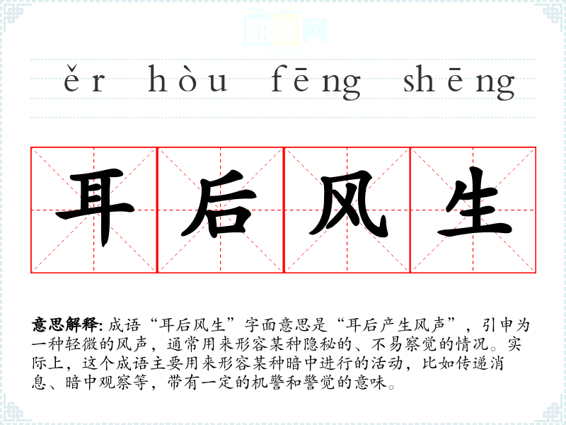 成语“耳后风生”字面意思是“耳后产生风声”,引申为一种轻微的风声,通常用来形容某种隐秘的、不易察觉的情况。实际上,这个成语主要用来形容某种暗中进行的活动,比如传递消息、暗中观察等,带有一定的机警和警觉的意味。