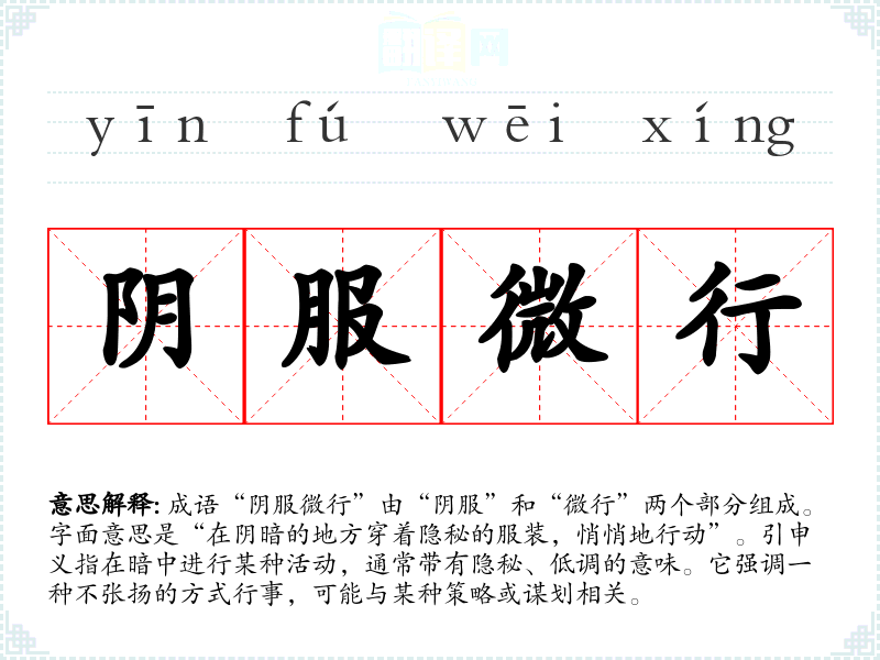 成语“阴服微行”由“阴服”和“微行”两个部分组成。字面意思是“在阴暗的地方穿着隐秘的服装,悄悄地行动”。引申义指在暗中进行某种活动,通常带有隐秘、低调的意味。它强调一种不张扬的方式行事,可能与某种策略或谋划相关。