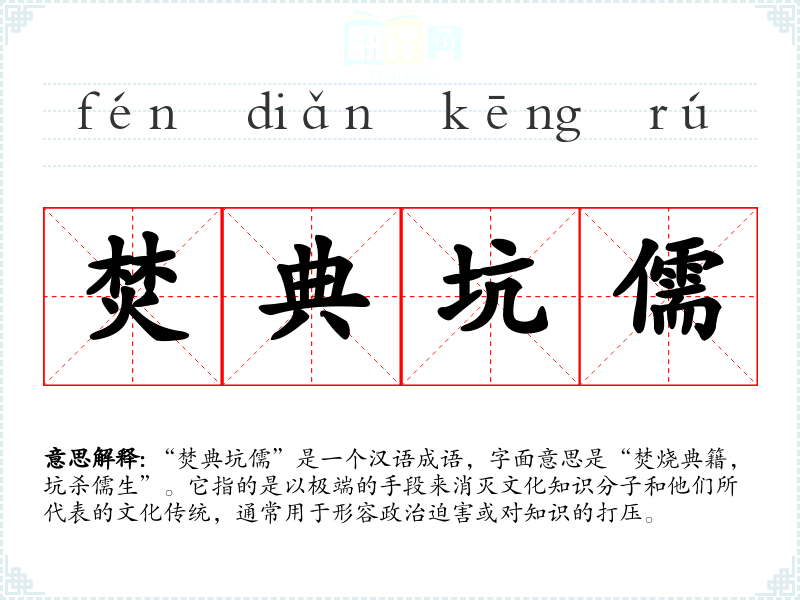 “焚典坑儒”是一个汉语成语,字面意思是“焚烧典籍,坑杀儒生”。它指的是以极端的手段来消灭文化知识分子和他们所代表的文化传统,通常用于形容政治迫害或对知识的打压。