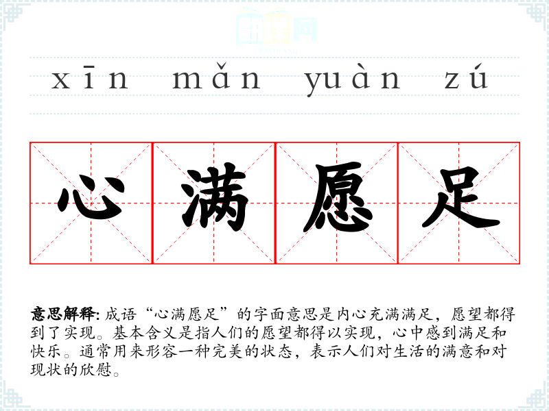 成语“心满愿足”的字面意思是内心充满满足,愿望都得到了实现。基本含义是指人们的愿望都得以实现,心中感到满足和快乐。通常用来形容一种完美的状态,表示人们对生活的满意和对现状的欣慰。