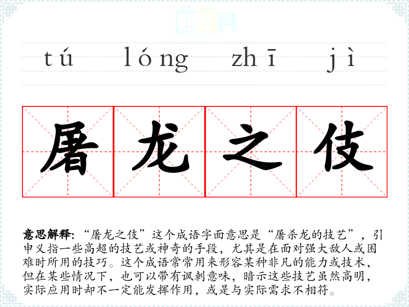 “屠龙之伎”这个成语字面意思是“屠杀龙的技艺”,引申义指一些高超的技艺或神奇的手段,尤其是在面对强大敌人或困难时所用的技巧。这个成语常常用来形容某种非凡的能力或技术,但在某些情况下,也可以带有讽刺意味,暗示这些技艺虽然高明,实际应用时却不一定能发挥作用,或是与实际需求不相符。