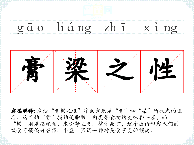 成语“膏梁之性”字面意思是“膏”和“梁”所代表的性质。这里的“膏”指的是脂肪、肉类等食物的美味和丰富,而“梁”则是指粮食、米面等主食。整体而言,这个成语形容人们的饮食*惯偏好奢侈、丰盛,强调一种对美食享受的倾向。