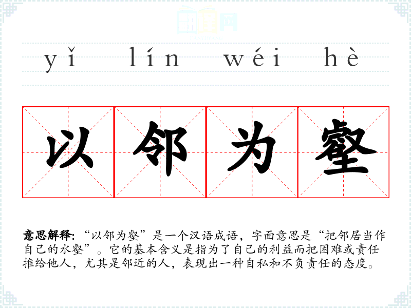“以邻为壑”是一个汉语成语,字面意思是“把邻居当作自己的水壑”。它的基本含义是指为了自己的利益而把困难或责任推给他人,尤其是邻近的人,表现出一种自私和不负责任的态度。