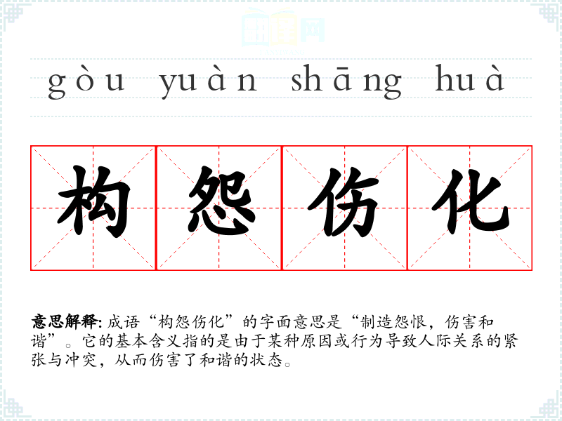 “构怨伤化”并不是一个历史悠久的成语,可能是现代网络语言或地方方言中流行的表达。它可以理解为对复杂人际关系中负面情感的总结,体现了人们在交流中对和谐关系的渴望和对冲突后果的警惕。